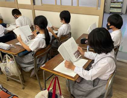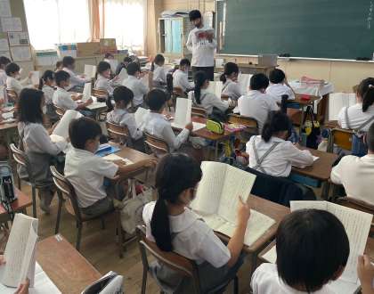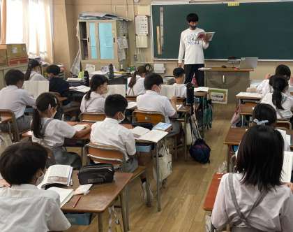 4年生の国語の時間です。説明文「くらしの中の和と洋」を読み、段落相互の関係に着目しながら、文章の比較構造を読み取っていきます。