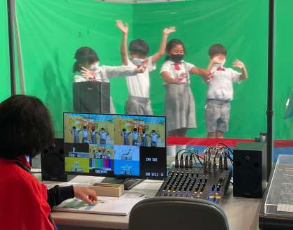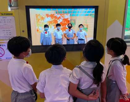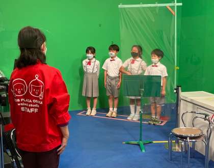 そして、ここは「わいわいスタジオ」。キャスターになって、ニュース番組をつくります。収録後に自分たちが出演する映像を見て、笑顔がはじけました。