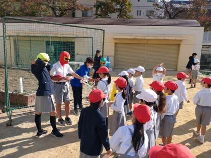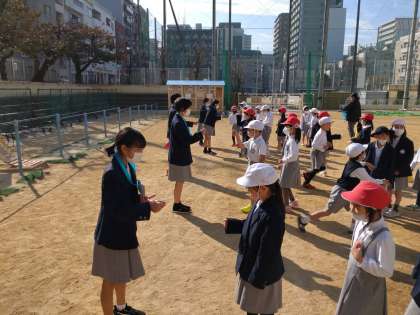 チャイムが鳴ると、たくさんの人が運動場に集まりました!