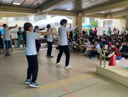 今回は密を避けるために、3部制で行われましたが、それぞれの部のオープニングで、先生たちのパフォーマンスが披露されました。まず第1部は、ダンスメドレーです。体育学習発表会で各学年の子どもたちが発表したダンスを見事に演じてくれました。