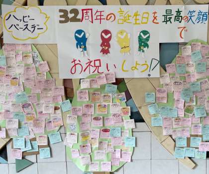 今日は32回目の創立記念日です。子どもたちが考えた32周年記念キャラクター「32(サニー)」とともにお祝いの気持ちで過ごしました。メッセージカードには温かい気持ちがたくさんこめられていました。