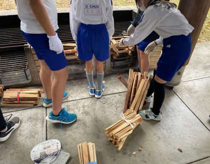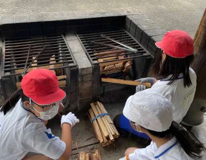 かまどでは、薪を井げたに組んで、火をおこす準備をしています。