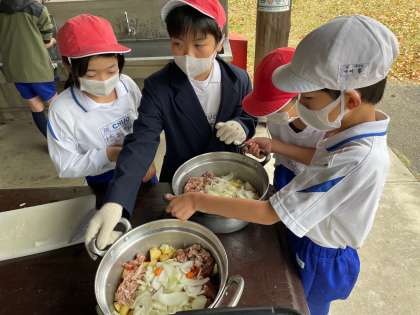 そして、こちらでは、肉やカレールーを細かくしています。これらを鍋に入れて、あとはかまどで火にかけていきます。