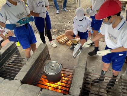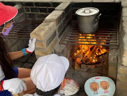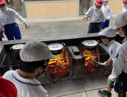 カレー用とご飯用、それぞれの鍋を火にかけます。火の番もしっかりと様子を見守っています。