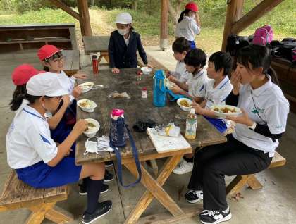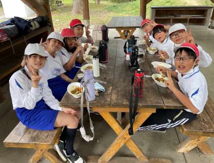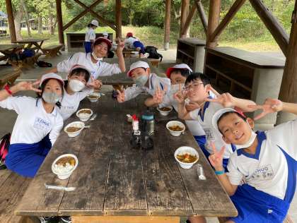 一番早くできあがった班と「はいポーズ?!」と記念撮影。その後も続々と完成し、班ごとにいただきますをしました。