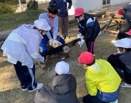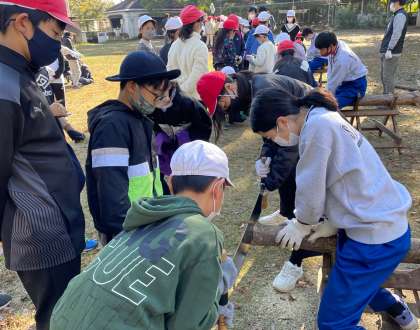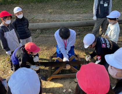 両手挽きのこぎりのコーナーでは、初めて見る大きなのこぎりに子どもたちはわくわく。職場体験に来ている地元の中学生も手伝って活動が進みます。
