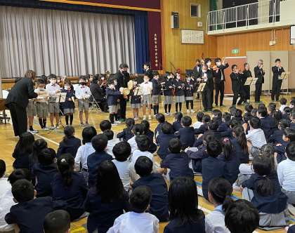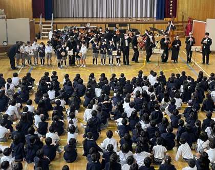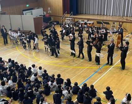 「オーケストラと一緒に演奏しよう!」のコーナーでは、各学年から代表の児童が出て、3種類の楽器を使って「おもちゃの交響曲」を演奏しました。