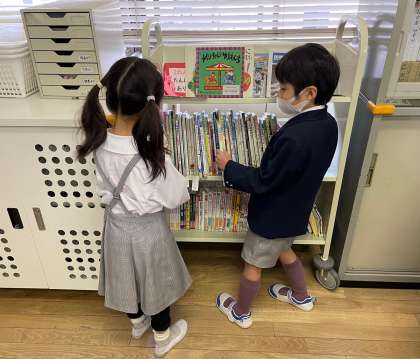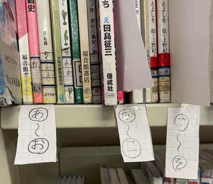2年生の教室です。休み時間に学級文庫の前で何やらごそごそ。何をしているのか聞いてみると、図書係さんが本の整理をしていたとのこと。よく見ると、手作りの五十音表示が貼られています。先日の市立図書館見学で学んだ本の並べ方をさっそく自主的に実行したみたいです。子どもたちってすごいですね!