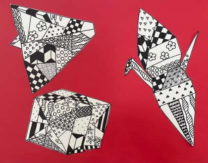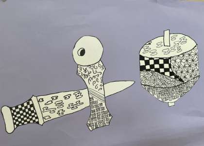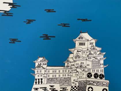6年生の作品です。これまで学習した和の文化で印象に残っているものを、絵画で表現しました。