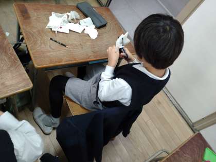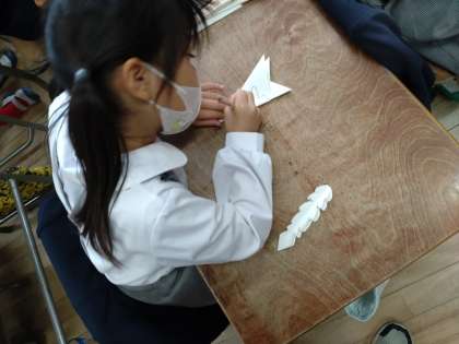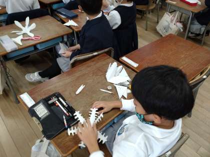 紙を折り重ねて、ジグザグやクネクネなどをかき、その通りに切って開くと…
