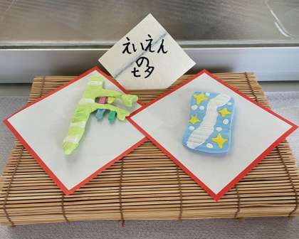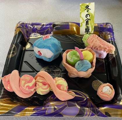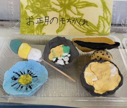 5年生の作品です。国語で教材文「和菓子をさぐる」を学習したあと、図画工作で和菓子をつくりました。