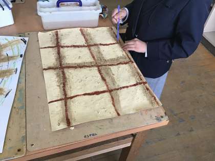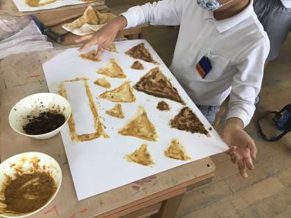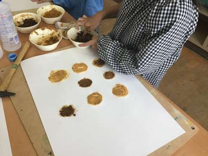土でつくった絵の具にもいろいろな色があります。同じ形を並べたり、重ね塗りをしたりと、思いのままに描いていきます。