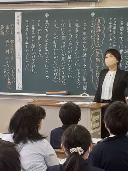 先日2年生にボールの投げ方を教えた活動を振り返って、自分たちの頑張りに気づいたり、これからの自分について考えたりしました。仲間とともに支え合うことの大切さについて学んだよい機会となりました。