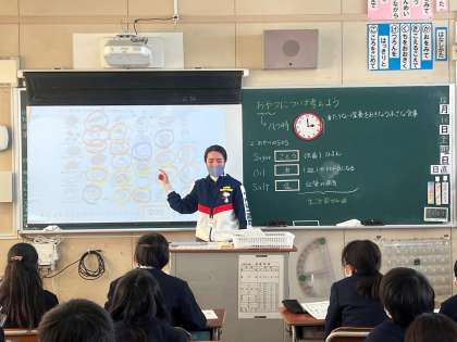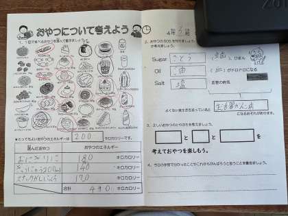 みんなの大好きなおやつの学習です。おやつとお菓子の違いや、1日のおやつの適切な摂取カロリーを知りました。おやつを食べすぎると、虫歯になったり血管の病気になったりすることを学習し、正しいおやつのとりかたを考えました。これからも、正しいおやつの食べ方を意識していきましょうね。