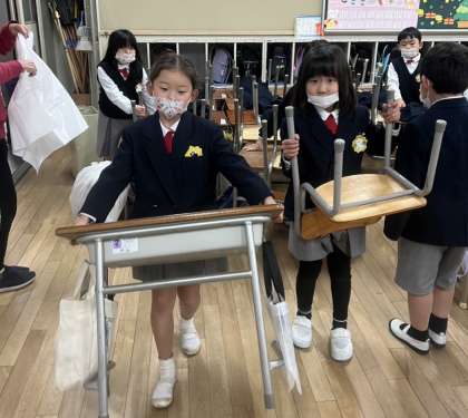 2学期終わりの大掃除の様子です。まずは、教室です。普段はなかなかできない部分も、みんなで力を合わせて、隅々まできれいにします。
