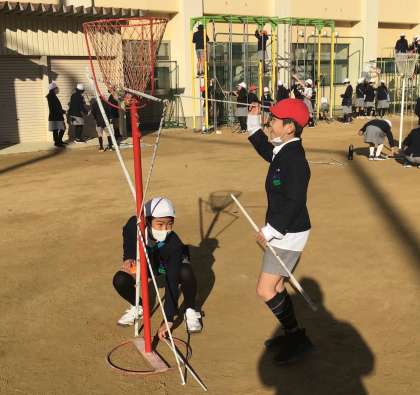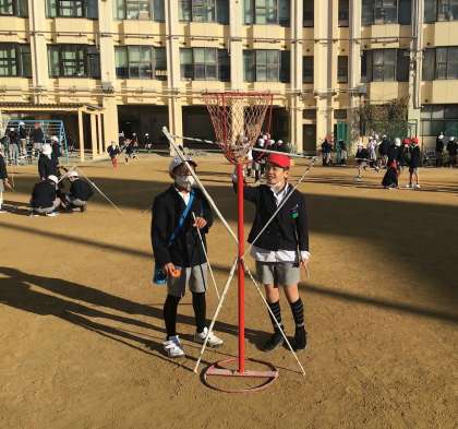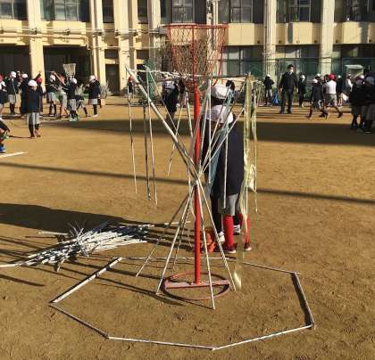 玉入れのかごをベースに、筒の装飾を施していきます。まるで巨大なトロフィーのようになりました。