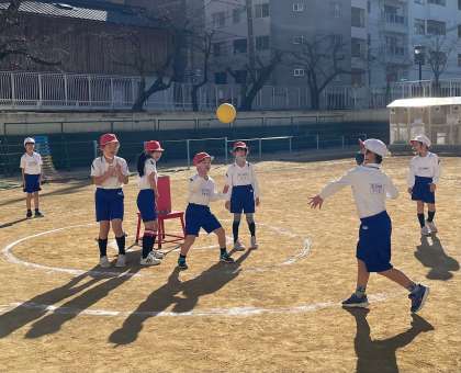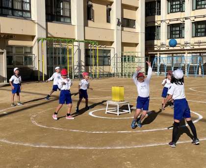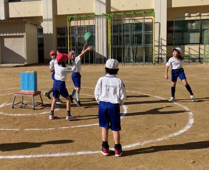 攻めるチームと守るチームに分かれて、パスをうまく使いながら、的をねらってシュートをします。