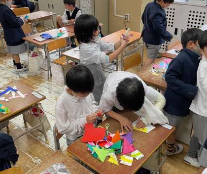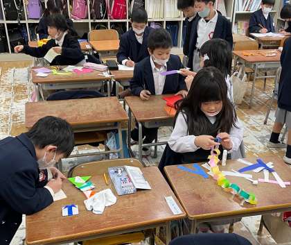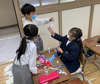 色紙を使って飾りを作ったり、景品のようなものを作ったりと、グループで協力しながら準備しています。