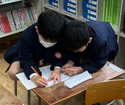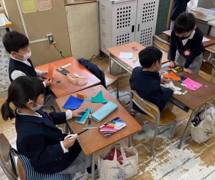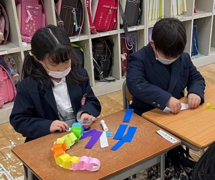 1年生の教室です。何やら楽しそうな声がするのでのぞいてみると、2学期終わりのお楽しみ会に向けて、準備をしていました。