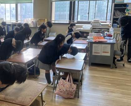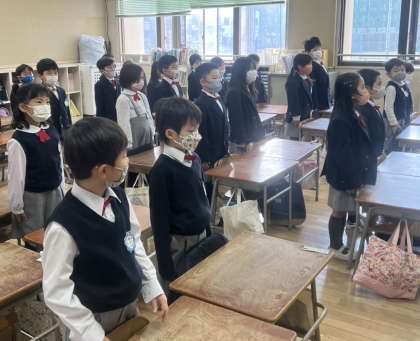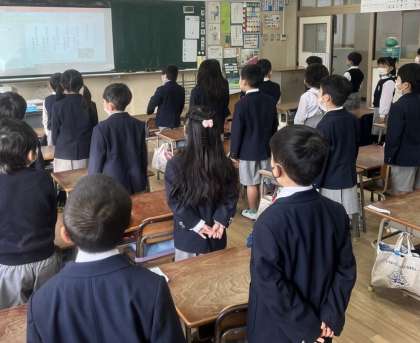 今日は、各教室で放送による始業式をおこないました。大阪市歌や校歌をきれいな声で歌いました。深々とおじぎをする姿も立派です。