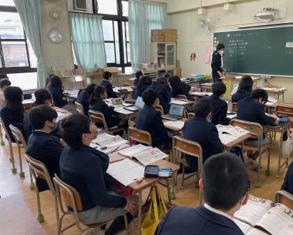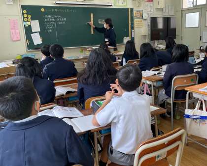 5年生の社会の時間です。新聞や雑誌、テレビやインターネットなど、たくさんの情報があふれる現代社会に生きる私たちの暮らしについて学習しています。