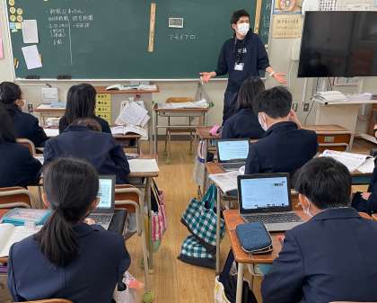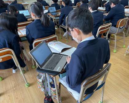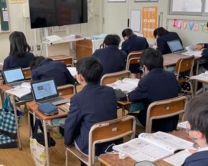 授業においても、情報収集ツールであるタブレットを用いて学習しています。近々、新聞社へ社会見学に行き、実際の新聞作成現場の様子について学ぶ予定です。