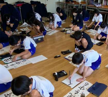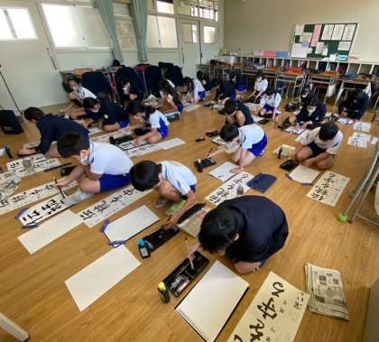6年生の教室です。机を端に寄せ床を広く使って、書き初めをおこないました。机上で書く時とは違った新鮮な気持ちで、長半紙に向かいました。
