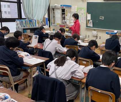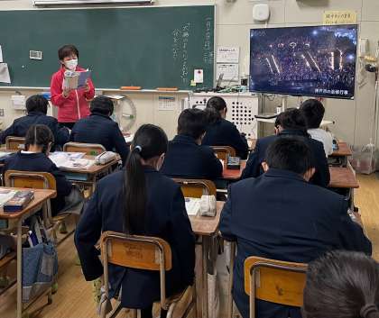 5年生の教室です。避難訓練のあと、さっそく道徳の授業で、阪神・淡路大震災で被災した人々が、つながり合い支え合って生きていこうとする姿を学習しました。子どもたちは、当時の様子を想像しながら、先生の朗読に聞き入っていました。