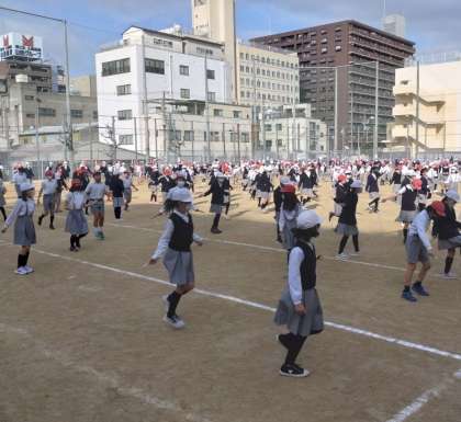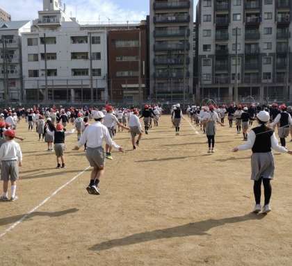 20分休みに広い瓦屋町グラウンドを使って、2つのグループに分かれておこなっています。まずは、2.4.6年生の様子です。