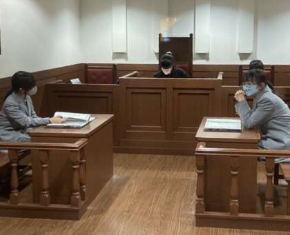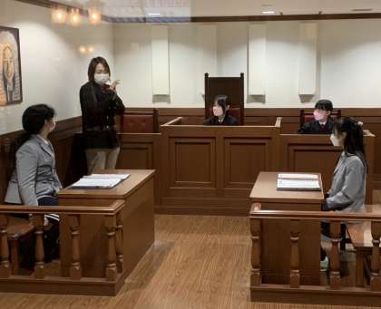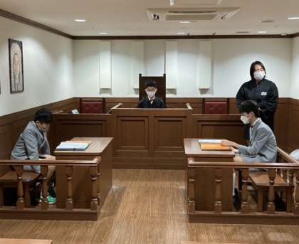 ここは、裁判所です。検察官、弁護士、裁判官などの役割に分かれて、模擬裁判をおこないます。