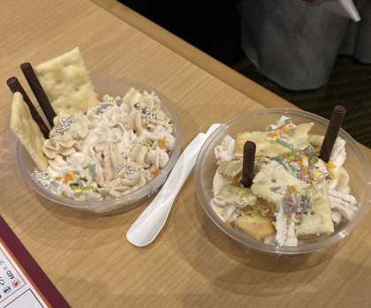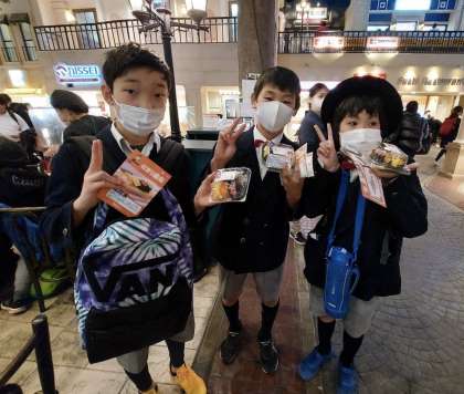 昼食は、グループごとに適宜とります。お寿司や焼きおにぎり、自分たちで作ったチーズケーキもあります。