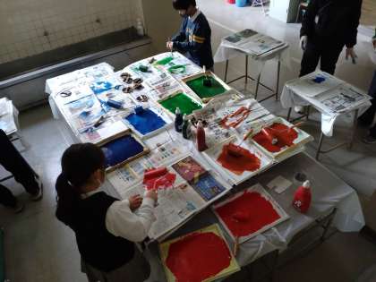 好きな色のインクを塗って、刷りたい位置を決めて、バレンや指で紙にしっかりとインクをなじませながら刷っていきます。