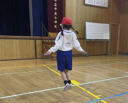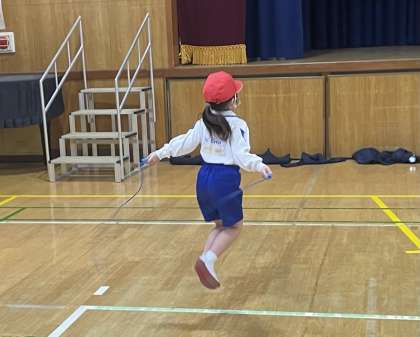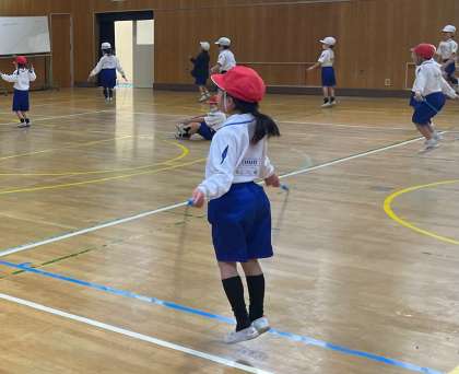 最後まで跳び続けた子が、なわとびチャンピオンです。失敗してしまった子も、まだ跳んでいる子を応援しています。みんな寒さに負けずに頑張っています。
