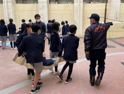 けが人を運ぶためのストレッチャー体験と、心臓マッサージ・AEDの講習です。