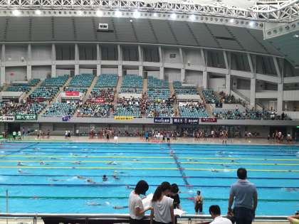 準備運動を終え、子どもたちはいまプール内でアップを行っています。