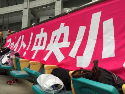 中央小の座席ですが、入り口から左手に進み、一階の中央付近となっています。ピンクの横断幕が目印です。