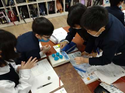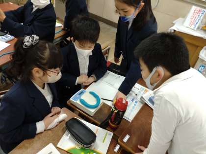 「ものの形を変えたとき、重さはかわるのだろうか」という課題に、実際に実験をして取り組んでいます。