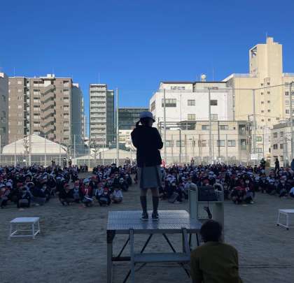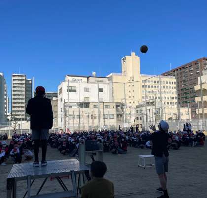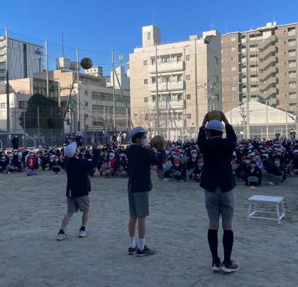 高く投げ上げたボールが青空に映えてとてもきれいです。つなげた言葉は「ありがとう!」「ファイト!」など、間もなく卒業する6年生に向けたメッセージとなっていました。最後の集会もとても楽しかったですね。