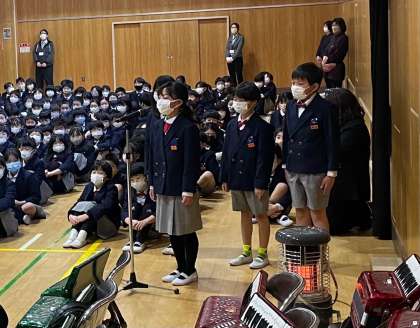 児童会主催の6年生の卒業をお祝いする集会が、二部に分かれて開催されました。まずは、1〜3年生の部です。3年生のフレッシュな司会で集会が始まりました。
