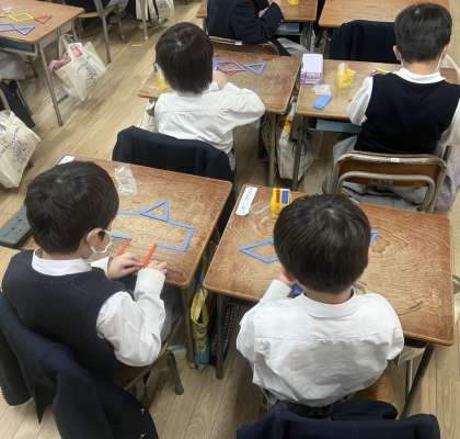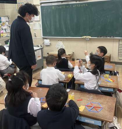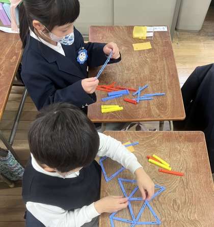 1年生の算数の時間です。カラフルな棒を使って、いろいろな形をつくります。先生、見て見て、こんな形ができたよ!…たくさんの棒をうまくつなぎ合わせながら、さまざまな形をつくりだしていました。