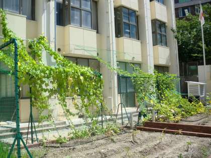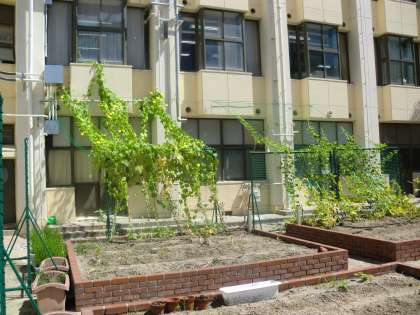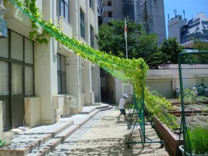 夏休み前に設置した棚ですが、植物が順調に成長し、緑のカーテンとなっています。