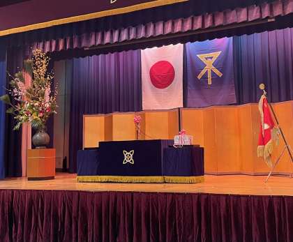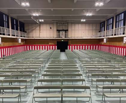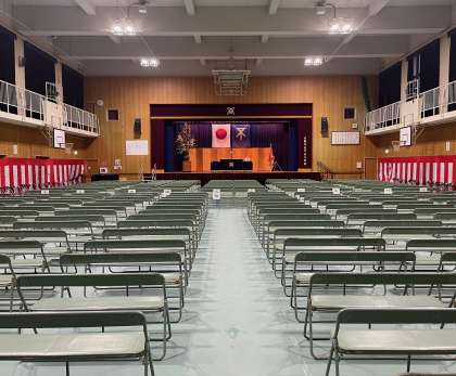 卒業式の会場は、準備万端整いました。舞台は、卒業生の登壇を静かに待っています。