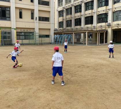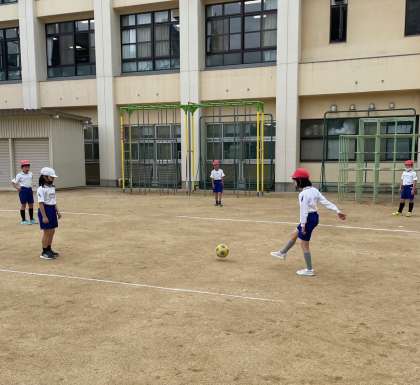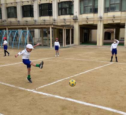 2年生の体育の時間です。ボールけりゲームの学習をおこなっています。