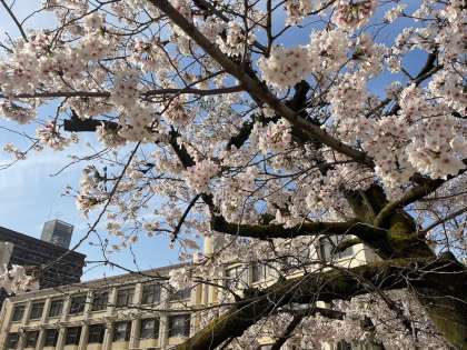 中央小学校の桜が美しい花を咲かせています。春休みのひととき、春爛漫の風景です。
