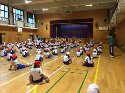 雨が降っているので体育館でダンスの練習をしています。