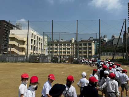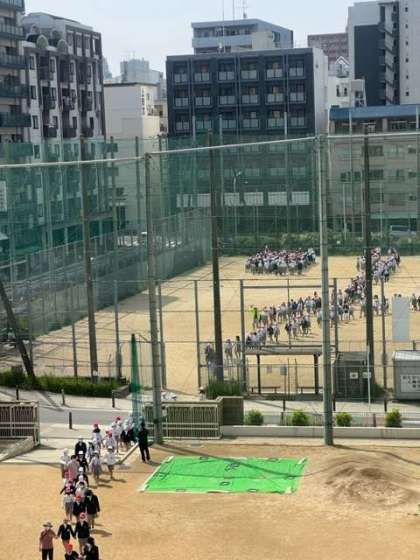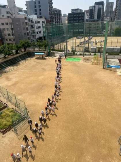 瓦屋町グラウンドに避難した後、次は津波を想定した避難訓練を実施しました。
