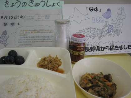 夏から秋においしいなすは、給食では7〜10月に出てくる野菜です。(10/6のなすのミートグラタンが今シーズンの最後)なすはインド生まれで、日本へは8世紀頃に中国から伝わりました。日本全国で栽培されており、地域により特徴のある品種がたくさんあります。加熱によりとろけるような食感となり、世界各国で好まれている野菜です。なすには体を冷やす働きが強く体内から余計な熱をとり、ほてりやのぼせをしずめてくれます。