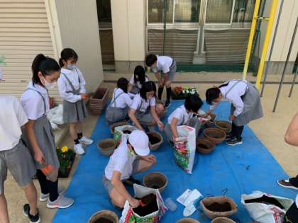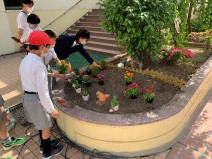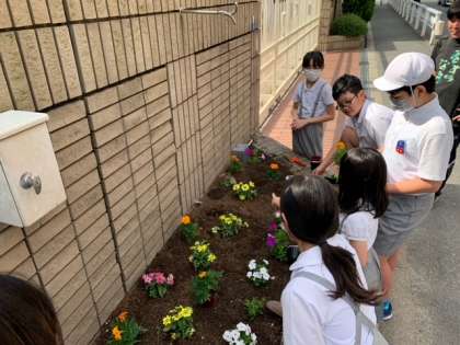 飼育園芸委員会は正門の花壇に花を植えました。とってもきれいですね!