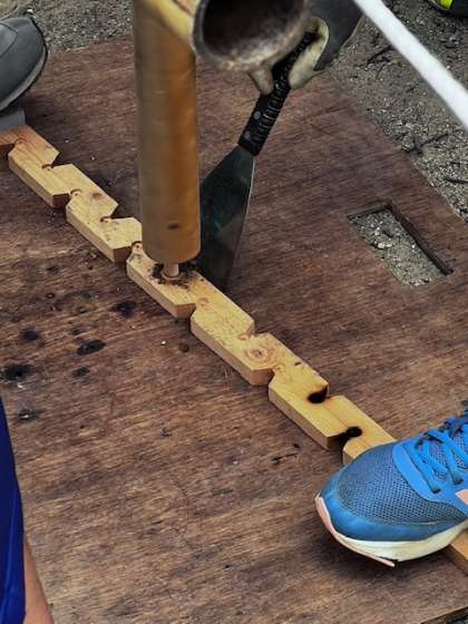 ひもと棒を使って、みんなで火おこしをしています。一人では難しくても、みんなで協力すると素早く火をおこすことができました。