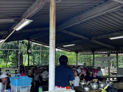 みんな真剣に説明を聞いています。美味しいピザを目指して、協力して頑張って!